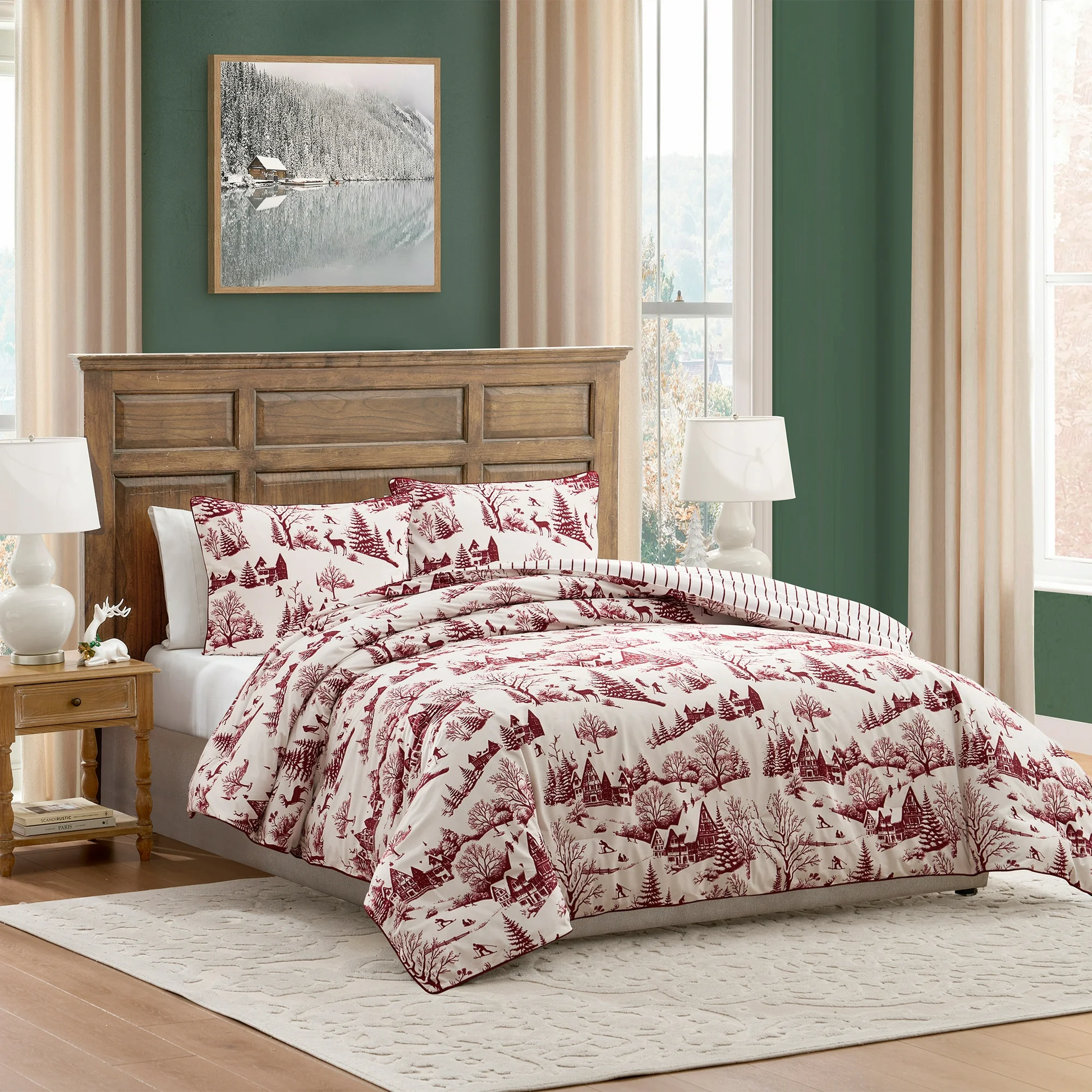 Cozy up in whimsical nostalgia with the My Texas House Aurora 2-Piece Black Toile Velvet Adult Comforter Set. This reversible comforter set captures the charm of the season with one side featuring a sketched winter toile print—complete with detailed illustrations of snowy houses, skiers, and reindeer—all on plush velvet fabric for a luxurious feel. Flip it over to reveal burgundy black and white stripes (also available in red) on pre-washed microfiber for an extra-soft feel. Each 2-piece bed set includes a comforter and decorative pillow sham to complete the look. You can keep this easy-care bedding set looking fresh by machine washing it in cold water with similar colors and drying it on a low setting as needed. Created by home decor blogger and influencer Erin Vogelpohl, My Texas House decor reflects Erin's signature modern farmhouse and fresh country style.